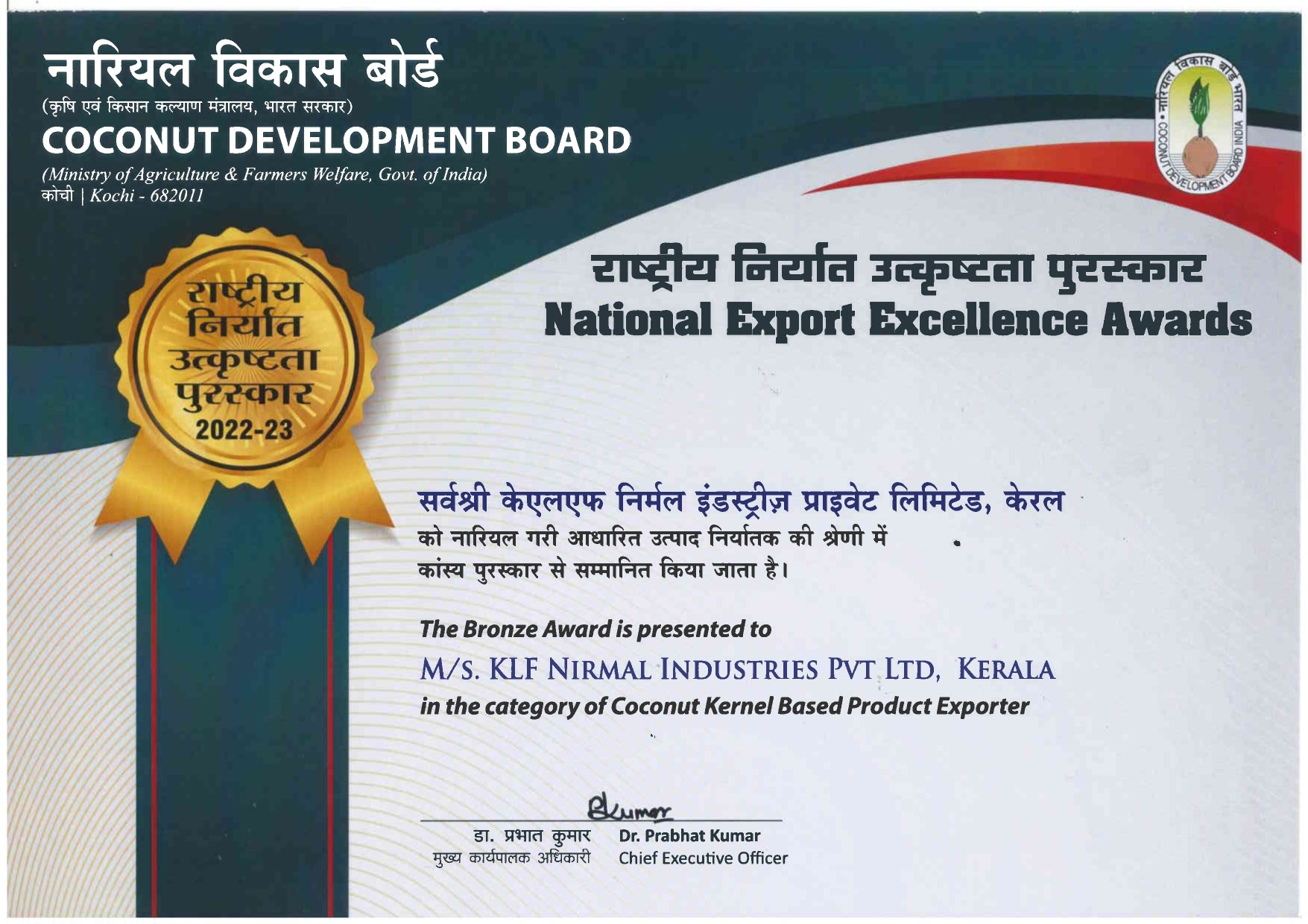 KLF Nirmal Industries (P) Ltd, honored with BRONZE AWARD at the prestigious NATIONAL EXPORTS EXCELLENCE AWARDS, presented by the COCONUT DEVELOPMENT BOARD under the Ministry of Agriculture & Farmers Welfare (Govt of India), for the year 2022-23
